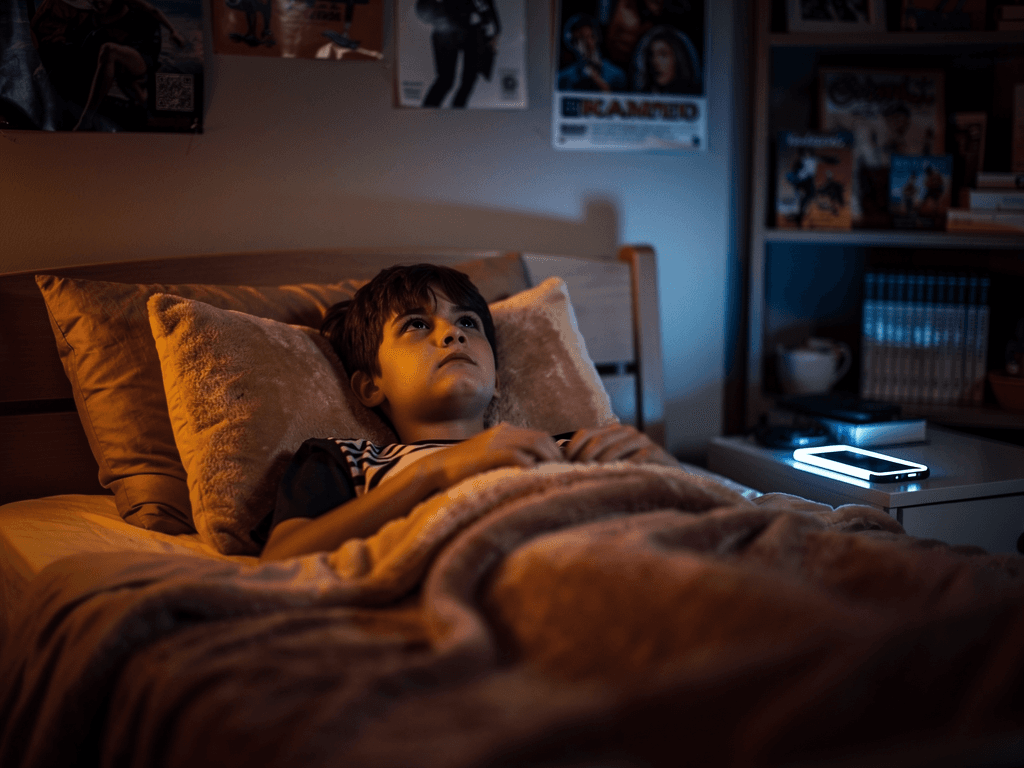 Evening screen use is associated with delayed sleep onset in children and adolescents, primarily through blue light's effect on melatonin suppression and through cognitive and emotional stimulation that keeps the brain alert. Studies show consistent correlations between bedtime device use and later sleep times. However, simply removing devices often doesn't fully resolve the issue — the underlying stimulation and anxiety patterns driving device use also drive delayed sleep independently.